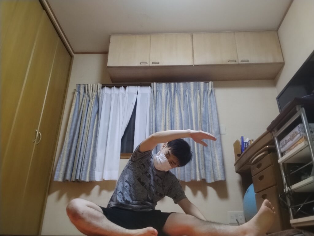 伸ばした側の腕も伸ばして脇腹あたりも刺激する。