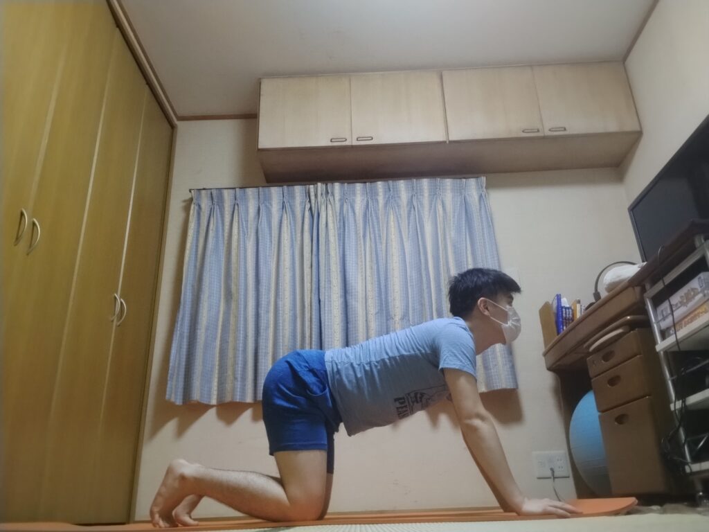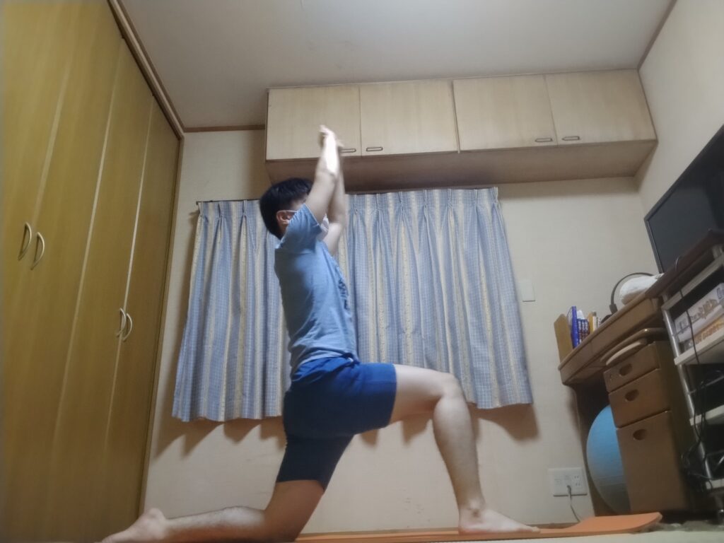ローランジのポーズ(1枚目):背中にめっちゃ効く。結構後ろに反ってるつもりなのに真上に行ってる。